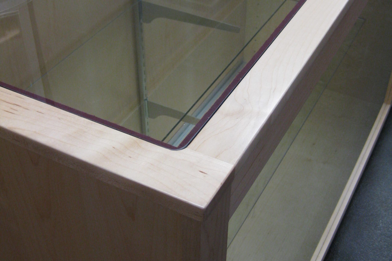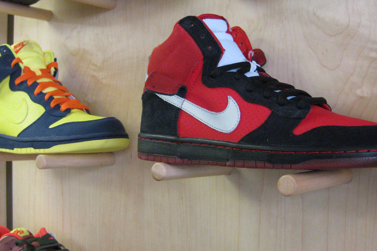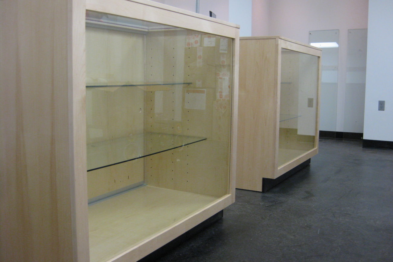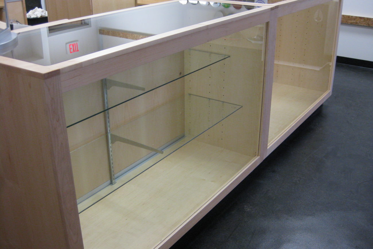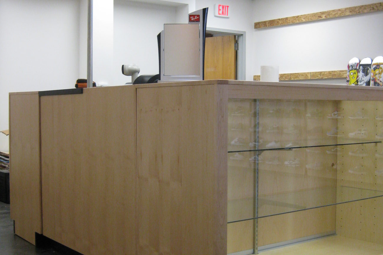 Sharp looking display cabinets with glass doors, and peg style wall displays for an up and coming skate shop.